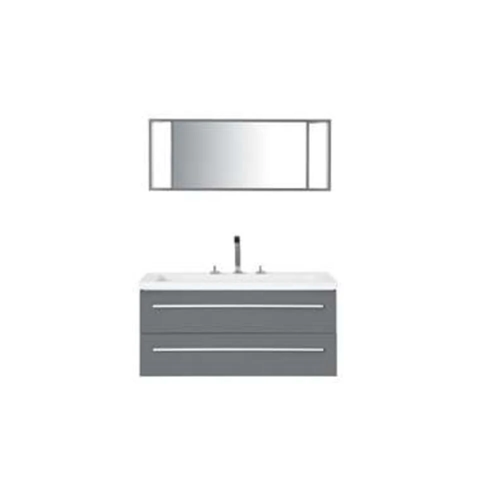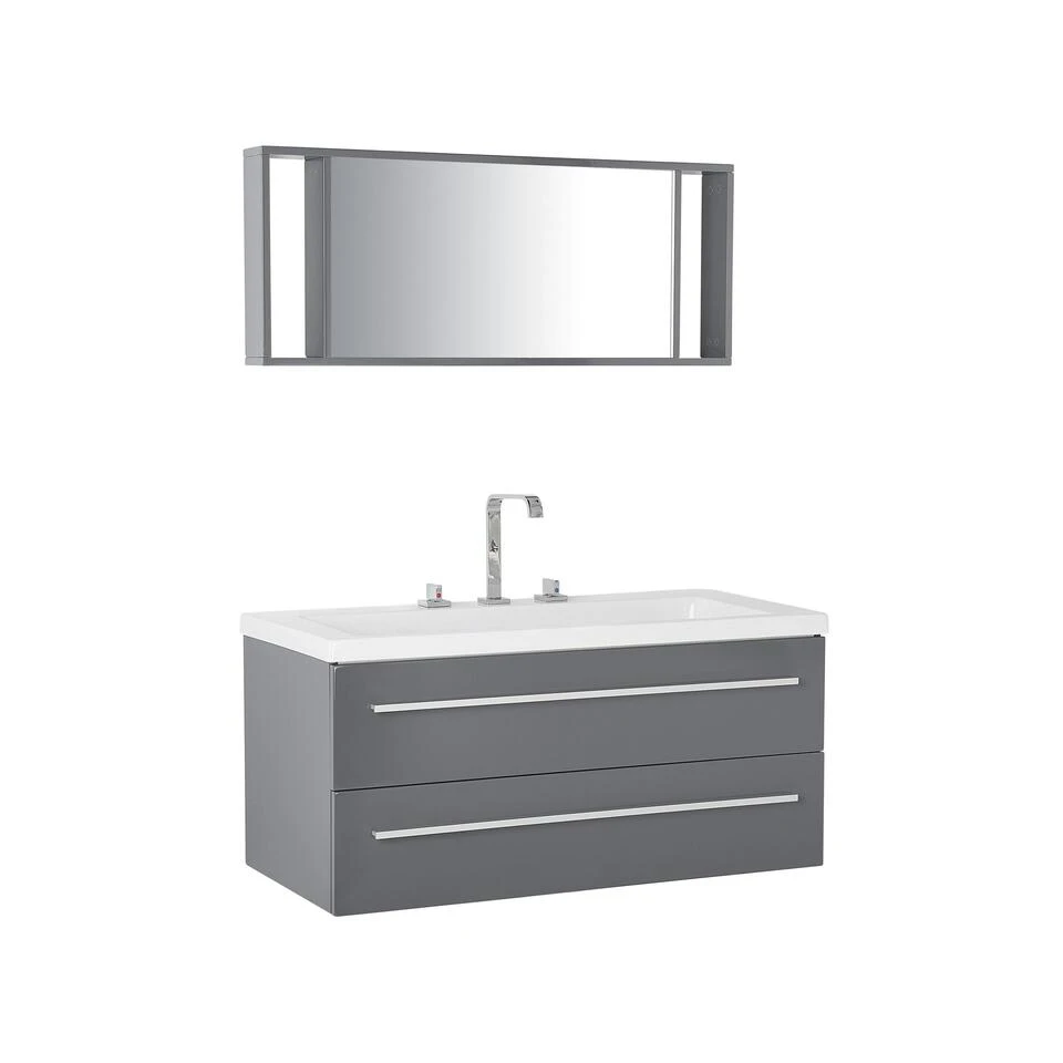 Exclusieve badkamermeubels in grijs. Met deze moderne badkamermeubelset begint jouw dag vroeg in de ochtend met een goed humeur! De structuur van de hangende kast is gemaakt van robuust MDF met melamine coating en de fronten van de twee laden hebben een coating van hoge kwaliteit PVC-folie in beige. De ruime laden bieden veel opbergruimte en zijn uitgerust met een soft-close-systeem. De bovenste lade bestaat uit twee grote compartimenten en een kleiner compartiment in het midden. De onderste lade heeft een scheidingslijn in het midden. De brede aluminium ladegrepen verbeteren de moderne uitstraling en het rechtlijnige ontwerp van deze set. De fraaie wastafel van wit acryl is bijzonder onderhoudsvriendelijk en eenvoudig te reinigen.
