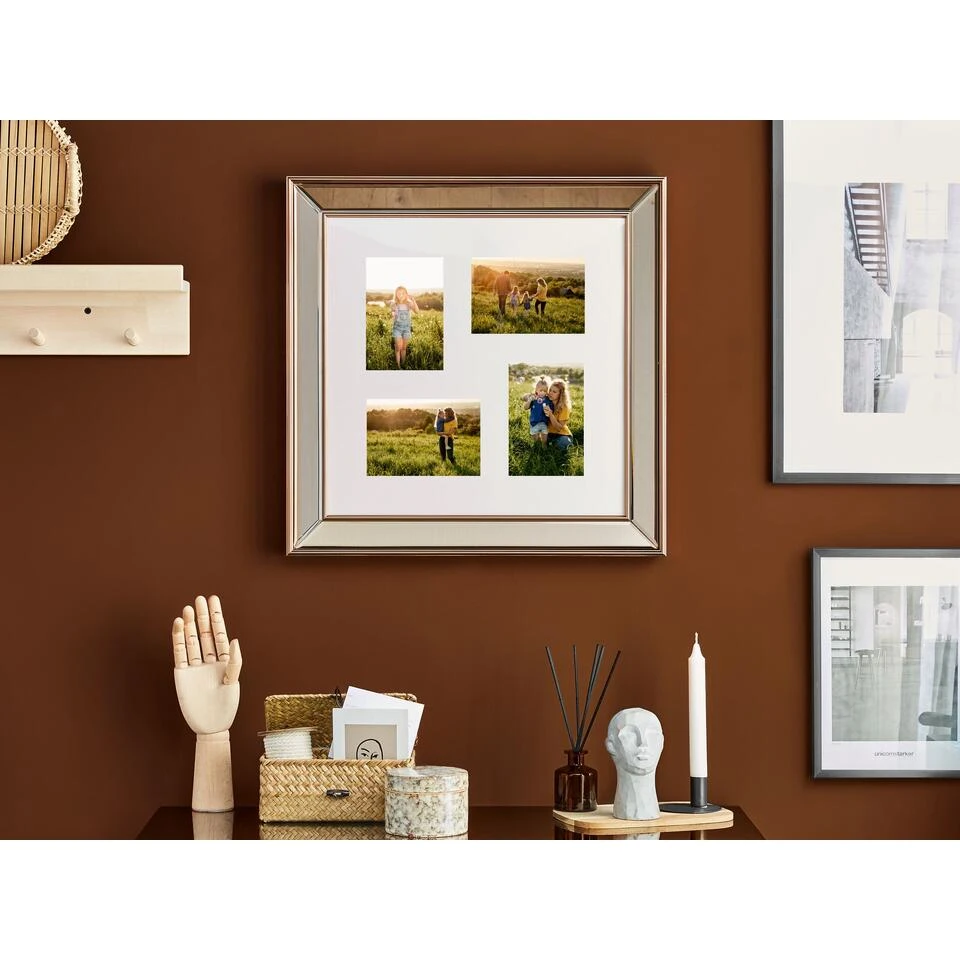 Collage fotolijst van kunststof met elegante spiegellook. Toon je favoriete herinneringen in deze stijlvolle multi-lijst met spiegeleffect in chique koperkleur. Het stuk past in maximaal 4 foto’s, dus je maakt een collage met al je dierbaren. Hang hem alleen aan de muur in je woonkamer, slaapkamer of gang of combineer hem met andere accessoires en decoraties.