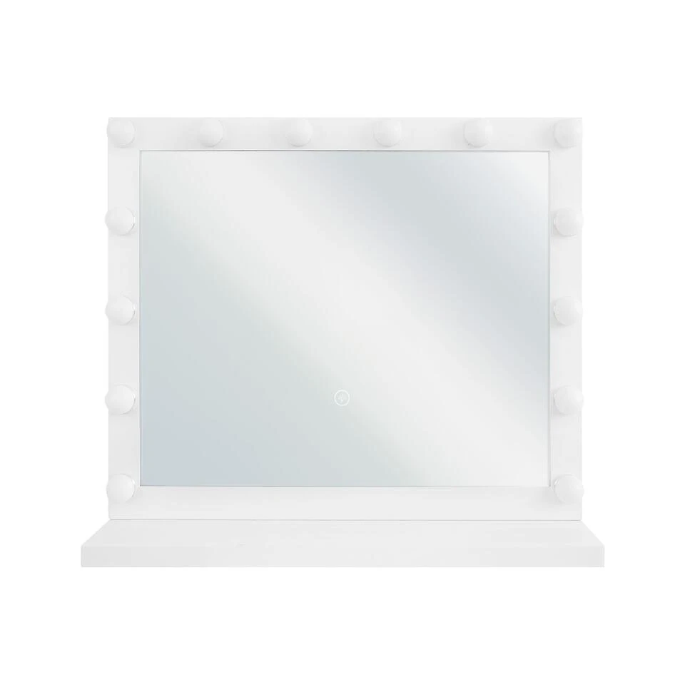 Witte spiegel met LED verlichting op praktische stand-voet. De ideale spiegel voor de slaapkamer of badkamer. Plaats de spiegel op je ladekast of naast de wastafel, het biedt extra verlichting dankzij de ingebouwde, aantrekkelijke ronde LED-verlichting. De wit gekleurde basis is subtiel en kan goed worden aangevuld met allerlei accessoires en decoratieve items.