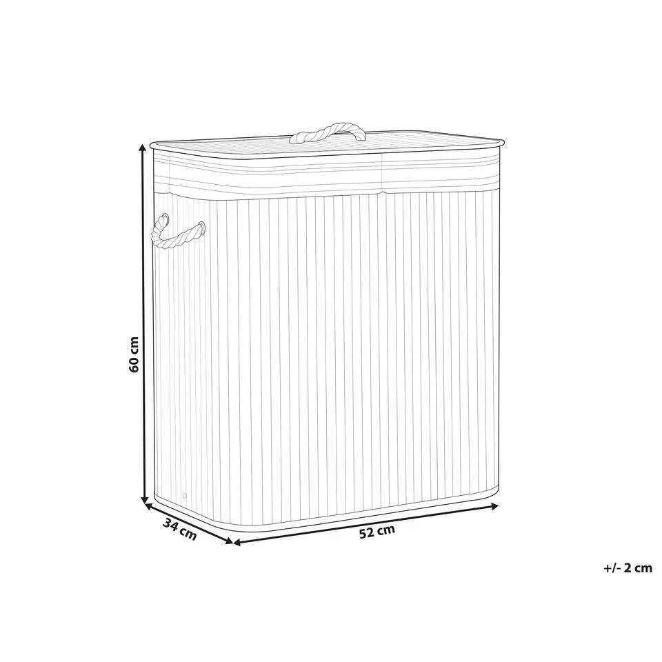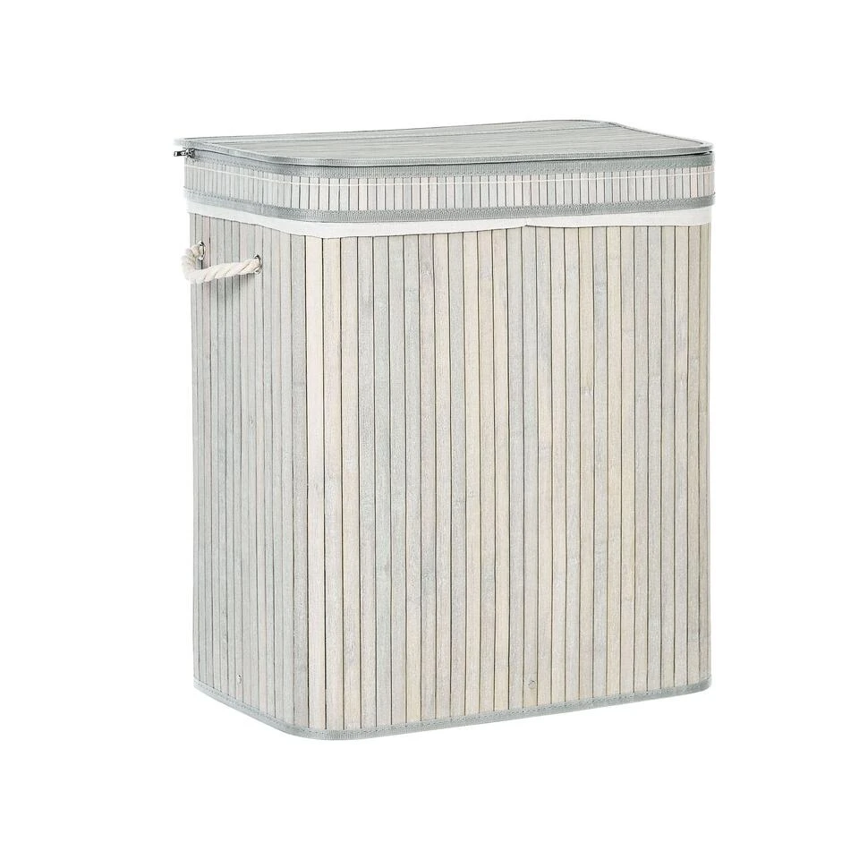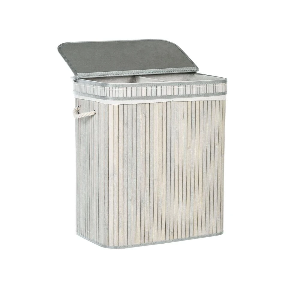 Bamboe wasmand met 2 vakken. Vind een perfecte plek voor je wasgoed, handdoeken of beddengoed in deze hoge mand. Hij is gemaakt van bamboe in een lichte tint en biedt voldoende opbergruimte voor alles wat je nodig hebt om te verbergen. De mand wordt geleverd met een deksel met ritssluiting voor handig gebruik en een wasbare binnenzak met twee compartimenten. Door het natuurlijke materiaal past het naadloos in elke moderne badkamer, slaapkamer of wasruimte.