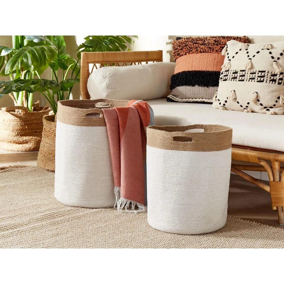 Set van 2 gevlochten opberg manden. Organiseer je ruimte met deze twee stoffen manden. Gemaakt van jute en katoen, beide sterke en natuurlijke materialen die de manden stevig maken waardoor je er verschillende spullen in kan opbergen, van dekens tot tijdschriften en boeken. Dankzij het ontwerp en de combinatie met natuurlijke kleuren passen de manden bij elk interieur en voegen ze een boho accent toe.