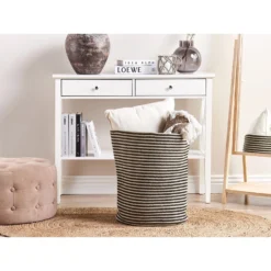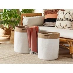 Set van 2 gevlochten opbergmanden. Vind een perfecte oplossing om je kussens en dekens op te bergen wanneer je ze niet gebruikt, zodat je ze tegelijkertijd bij de hand hebt als dat nodig is. Deze set van 2 opbergmanden is een zeer stijlvolle optie die elke ruimte zal opfleuren. Hij kan in een woon- of slaapkamer worden geplaatst en biedt plaats aan alle snuisterijen. De producten zijn handgemaakt van jute, wat garant staat voor een natuurlijk karakter.