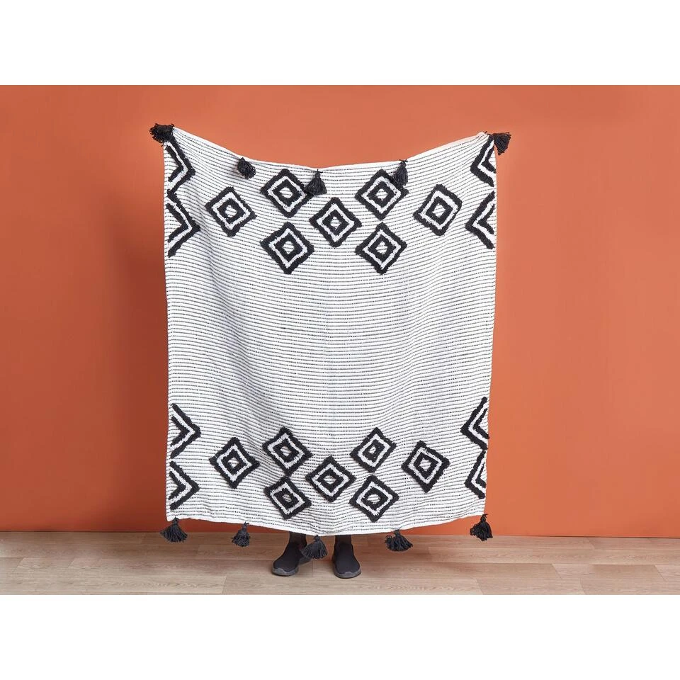 Deken met decoratieve kwastjes. Ervaar het toppunt van eigentijdse stijl met deze stijlvolle, handgemaakte polyester deken. Het stuk is versierd met een zwart geometrisch patroon op een wit oppervlak dat erg veel aandacht trekt. Je kunt het gemakkelijk combineren met verschillende interieurstijlen. Omdat het handgemaakt is, combineert het duurzaamheid met zachtheid, zodat je er lekker onder kunt liggen tijdens koudere avonden. Tot slot is de deken onderhoudsarm en milieuvriendelijk omdat hij gemaakt is van gerecycled polyester.