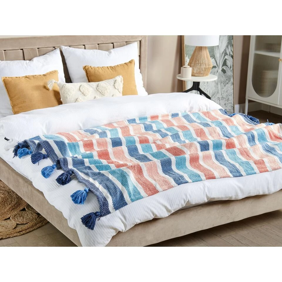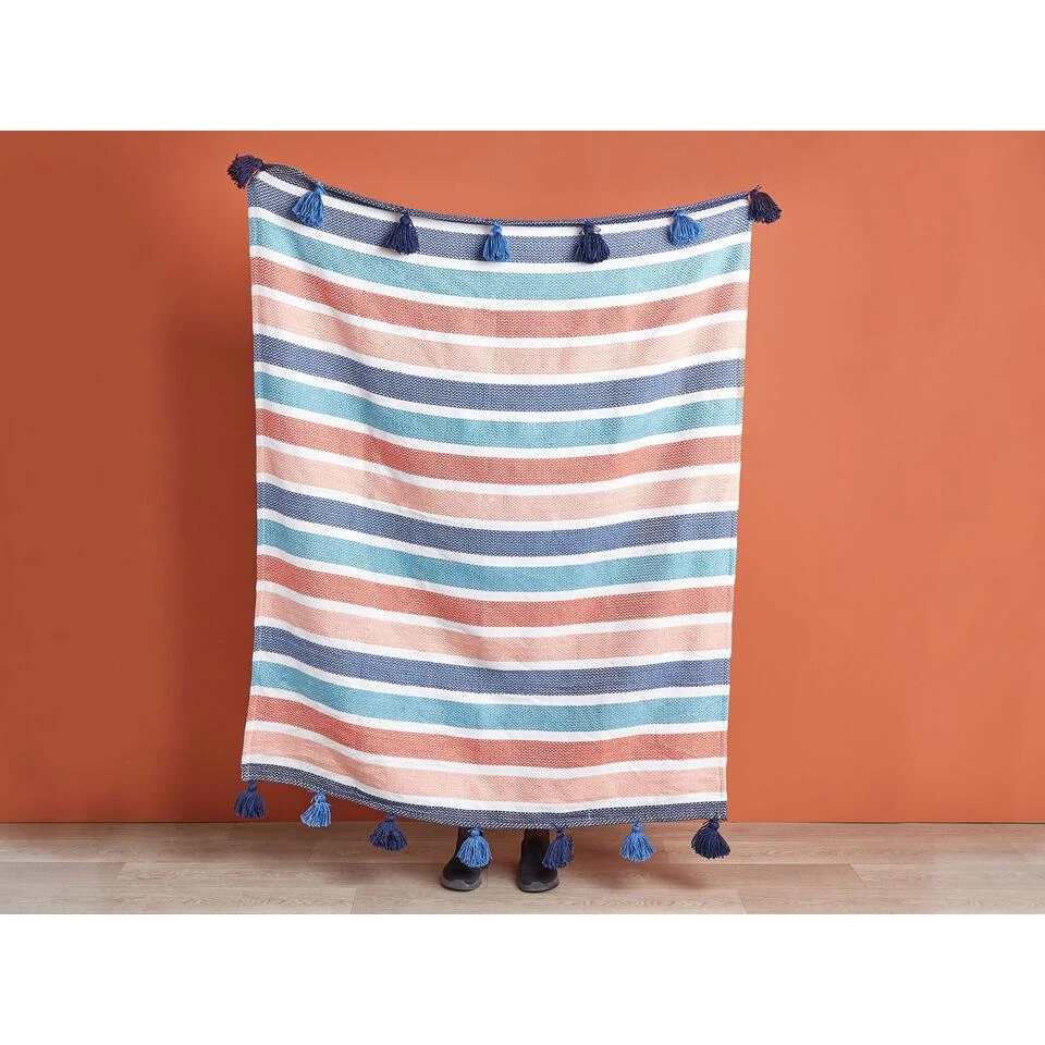 Deken met decoratieve kwastjes. Versier je woonruimte met deze kleurrijke plaid om een zomerse, boho vibe in elke ruimte te introduceren. Het textiel heeft strepen in rode en blauwe tinten, dus het past goed bij verschillende decoraties. Omdat het gemaakt is van gerecycled polyester, is de deken zeer duurzaam en tegelijkertijd zacht en aangenaam om aan te raken, zodat je hem vrij kunt gebruiken in je slaapkamer of woonkamer.