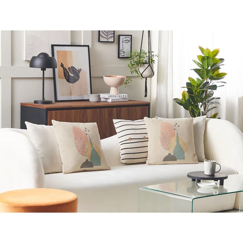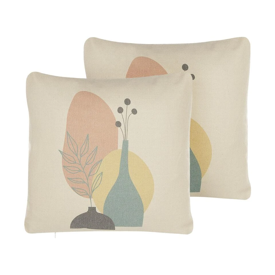 Twee decoratieve bankkussens met een abstract plantenmotief. Deze kussenset geeft je huis een frisse flair. Met zijn sierlijke print met bloemenvazen zal het zeker een echte blikvanger zijn. Plaats hem waar je een vleugje meer kleur wilt, op de bank in de woonkamer of op het bed. Met hun subtiele pastelkleuren passen de kussens goed bij elke kleurstelling.