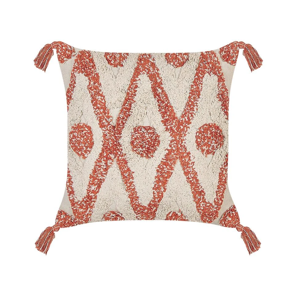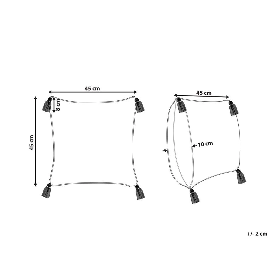 Vierkant kussen met vulling. Dit unieke, handgemaakte kussen zal zeker een boho-sfeer aan je huis toevoegen en het algehele ontwerp van je leefruimte verbeteren. Het is gemaakt van hoogwaardig katoen en is dik en erg zacht, dus het kan gebruikt worden in een woonkamer als decoratie, of in een slaapkamer als extra bedkussen. Aan de voorkant heeft het kussen een prachtig geometrisch patroon en elke hoek is versierd met kwastjes in bijpassende kleur.