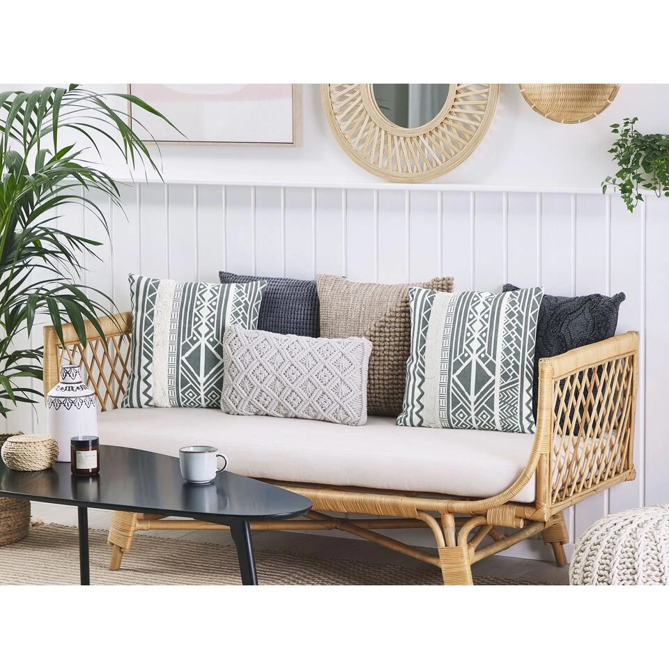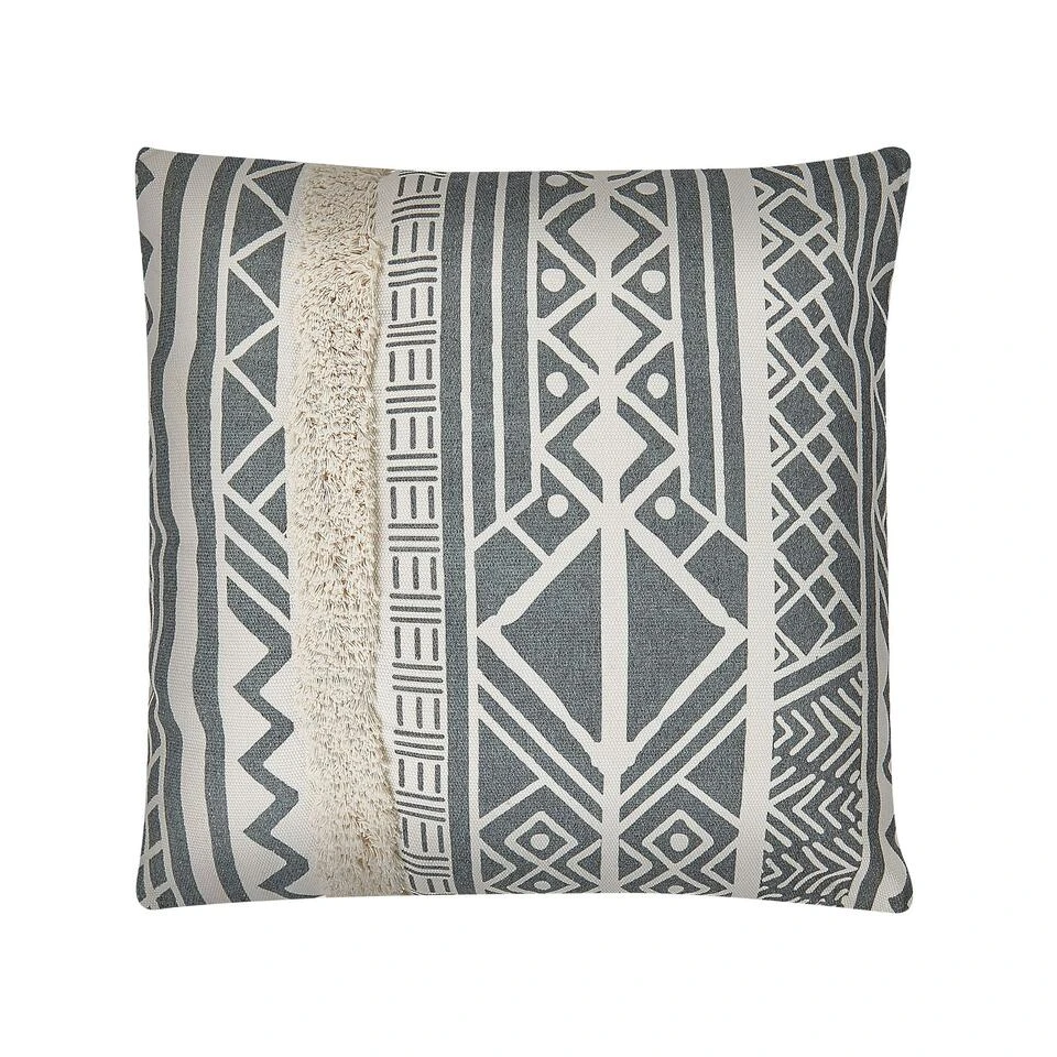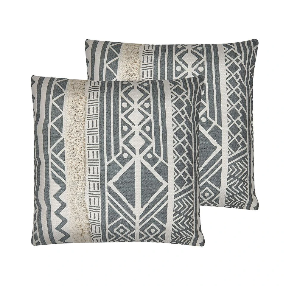 Set sierkussens versierd met franjes. Het gebruik van sierkussens is een gemakkelijke manier om het interieur er zonder al te veel moeite leuk uit te laten zien. Deze set heeft een origineel ontwerp met een geometrisch patroon en een smalle decoratieve franje. De hoezen zijn gemaakt van duurzaam polyesterweefsel en kunnen worden verwijderd voor reiniging.