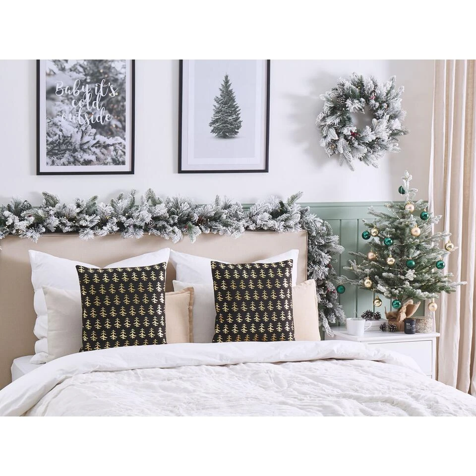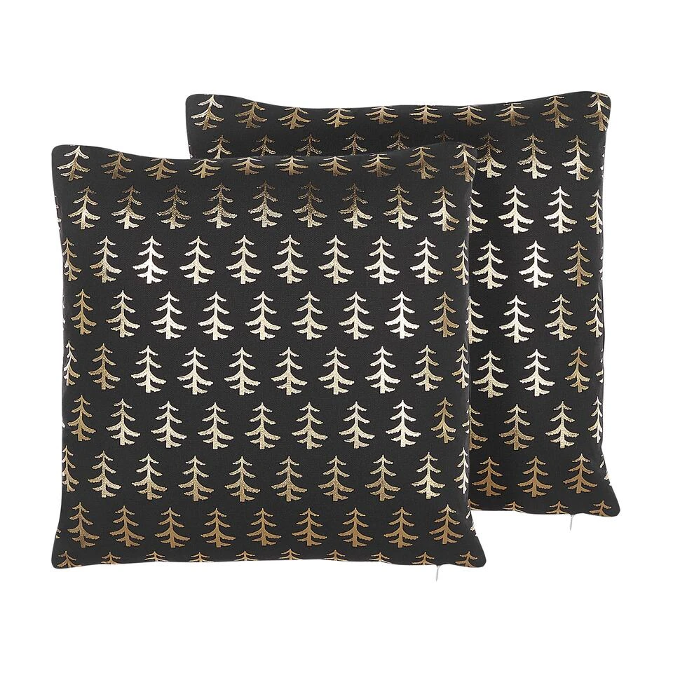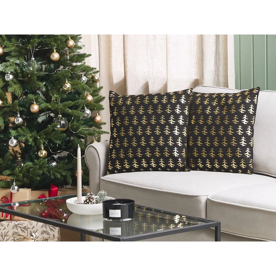 Set van 2 Elegante Kerstmis Kussens. Deze set van twee elegante sierkussens is een perfecte aanvulling op elk verfijnd interieur. Elk van hen heeft een hoes gemaakt van onderhoudsarm kattoen een een rissluiting zodat deze eenvoudig gereinigd kunnen worden. Bovendien heeft de voorkant een gouden, met folie bedrukt kerstboompatroon, wat er voor zorgt dat de kussens een prachtig decorelement zijn voor elke setting met een kerst thema.