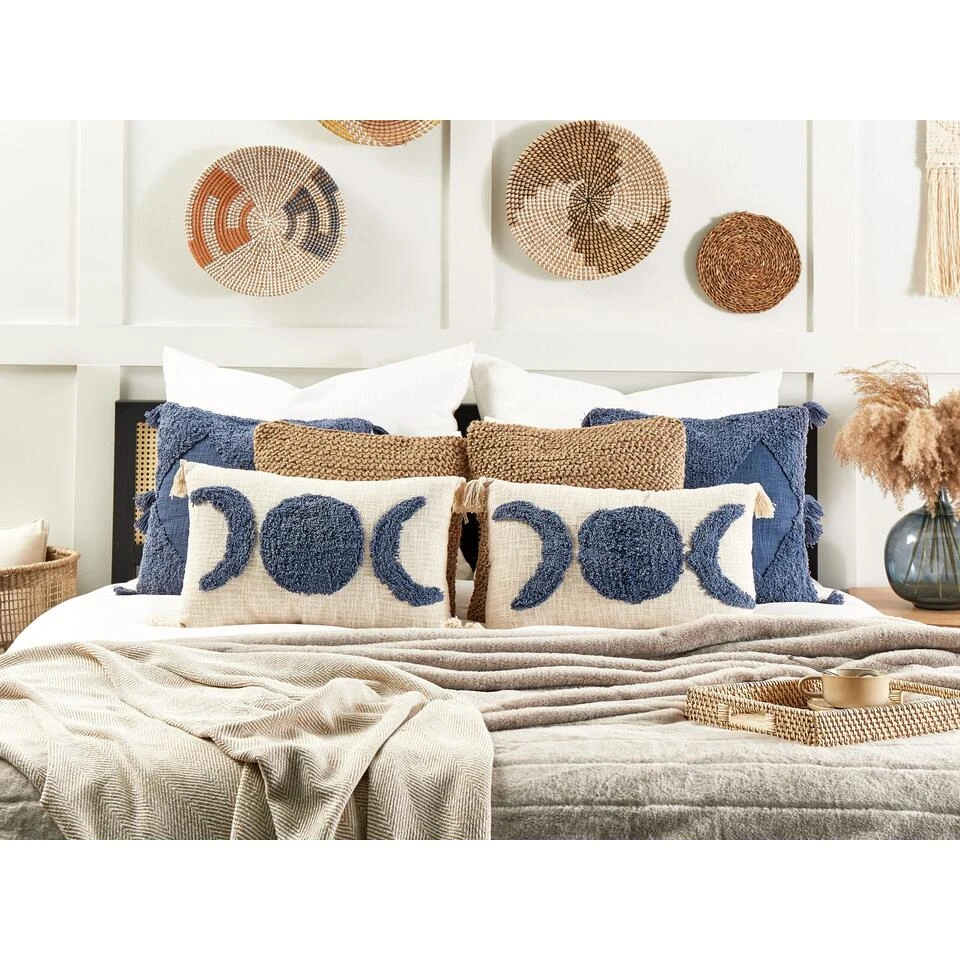 Boho stijl sierkussen. Dit prachtige kussen met geborduurde accenten in blauw maken elk interieur gezellig en uitnodigend. Het getextureerd patroon en de kwastjes geven het een vintage gevoel waardoor het perfect past bij boho of retro kamers. Dankzij de rechthoekige vorm zorgt ervoor dat het kussen er prachtig uitziet op je bed. Stijlvol en functioneel kussen, een charmante accessoire voor elk interieur.