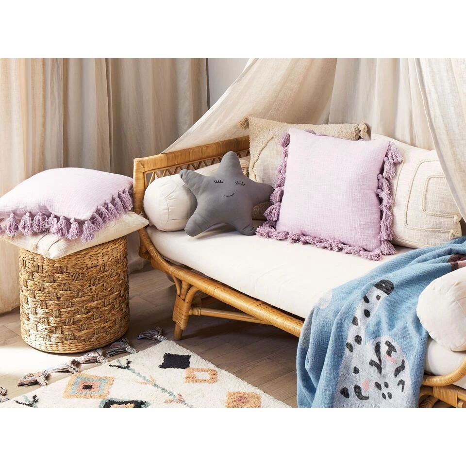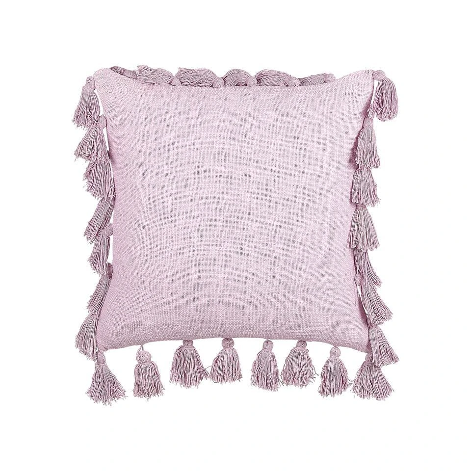 Decoratief kussen. Maak je bank of bed af met dit simpele maar stijlvolle sierkussen. De kussensloop is gemaakt van hoogwaardig katoen en de dikke vulling is zacht polyester. De mooie roze kleur en de kwastjes aan de zijkanten geven het sierkussen een boho look. De hoes met ritssluiting is gemakkelijk schoon te maken.