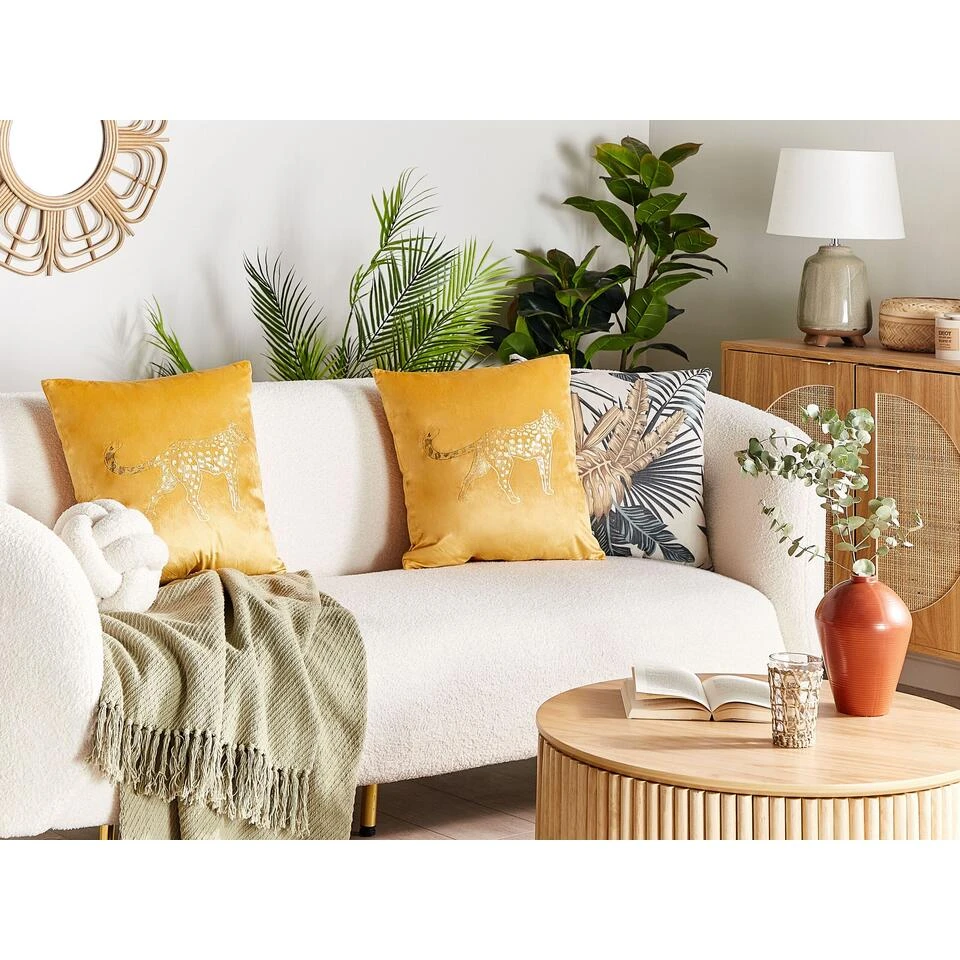 Sierkussens met dierenprint. Geef je interieur een exotisch tintje en decoreer het met deze set kussens. Dankzij de gouden versieringen passen ze bij andere meubels of accessoires met accenten in dezelfde kleur. Ze zijn gemaakt van polyester, ze zijn comfortabel, zacht en duurzaam. Ze hebben geen speciale zorg nodig en kunnen worden schoongemaakt dankzij de afneembare hoezen. Ze zullen een opvallende toevoeging zijn in elke woonkamer of slaapkamer in moderne en Safari-stijl.