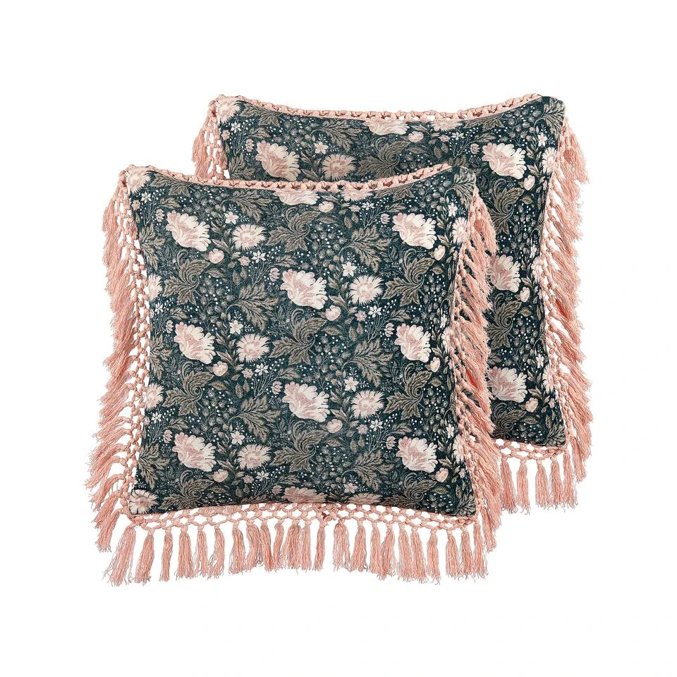 Set van 2 kussens met bloemenpatroon . Geniet van de onmiskenbare schoonheid van deze kussens bij je thuis en leg ze op een bank of bed om het ontwerp op te fleuren. De stukken hebben een subtiel bloemenpatroon in roze en blauwe tinten, dat wordt aangevuld met sierlijke kwastjes aan de randen. Gebruik de kussens alleen of in combinatie met andere decoraties om je eigen unieke look te creëren.