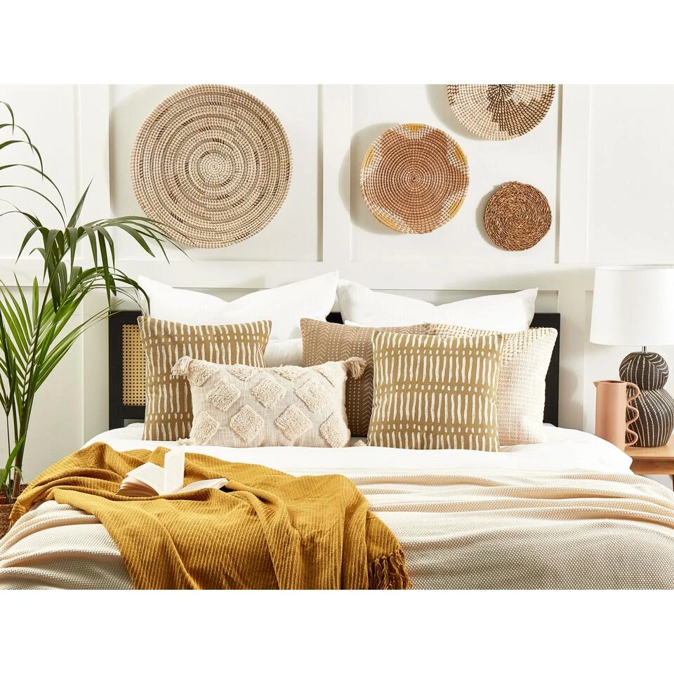 Handgemaakt decoratief kussen met geometrisch patroon. Geef je decor een upgrade en versier je woonkamer of slaapkamer met dit decoratieve kussen in zandbeige kleur. De katoenen hoes is handgemaakt en heeft een zachte vulling en ritssluiting. Het opvallende geometrische patroon is perfect voor moderne en boho interieurs.
