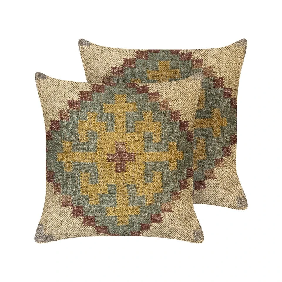 Handgeweven sierkussens met oosters patroon. Haal een vleugje oosters design in huis met deze prachtige handgeweven kussenset. De kelim-achtige hoes is met de hand gemaakt met behulp van de traditionele Panja-weeftechniek, daarom kun je er zeker van zijn dat het stuk dat je ontvangt uniek is. De gebruikte materialen, voornamelijk jute met een toevoeging van wol, geven het een authentieke, natuurlijke uitstraling. Het meerkleurige, aardse kleurenpalet verwarmt elk decorschema en past bijzonder goed in boho- en eclectische stijlruimtes.