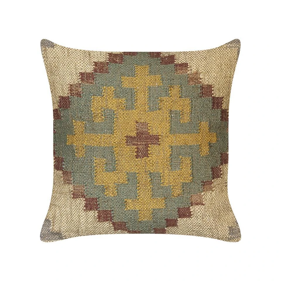 Handgeweven sierkussen Oosters patroon. Haal een vleugje oosters design in huis met dit prachtige handgeweven kussen. De kelim-achtige hoes is met de hand gemaakt met behulp van de traditionele Panja-weeftechniek, daarom kun je er zeker van zijn dat het stuk dat je ontvangt uniek is. De gebruikte materialen, voornamelijk jute met een toevoeging van wol, geven het een authentieke, natuurlijke uitstraling. Het meerkleurige, aardse kleurenpalet verwarmt elk decorschema en past bijzonder goed in boho- en eclectische stijlruimtes.