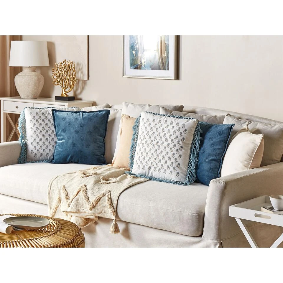 Blokdruk vierkant kussen. Met dit moderne kussen trek je zeker de aandacht van al je gasten. Het is gemaakt van hoogwaardig fluweel en voelt zacht aan en is zeer duurzaam. Het is ook gemakkelijk schoon te maken omdat het een ritssluiting aan de achterkant heeft. Bovendien heeft het kussen een patroon dat is gemaakt met behulp van een blokdruktechniek – dus zowel uniek als fijn.