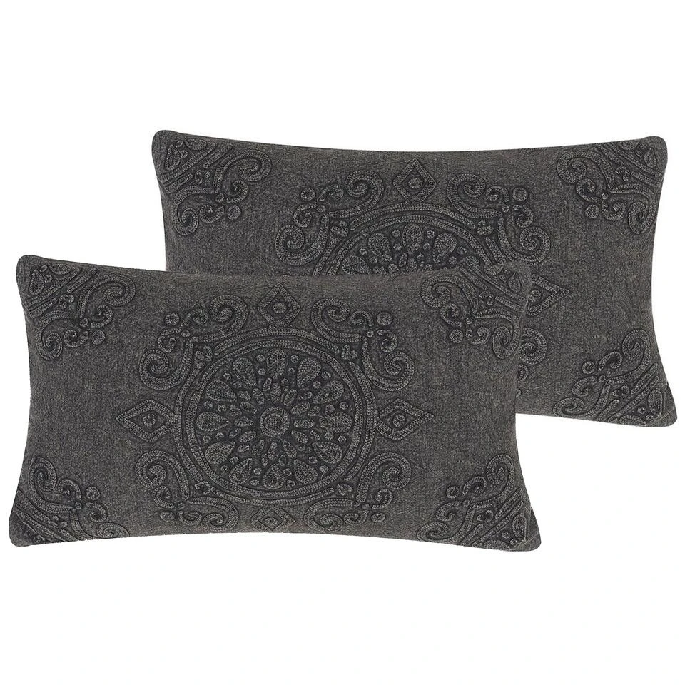 Sierkussen in boho – stijl. Dit donker-grijze decoratieve kussen van hoge kwaliteit inspireert met het boho-ontwerp, geïnspireerd op een mandala-patroon. Dankzij de gegraveerde decoratieve motieven geeft dit woonaccessoire je interieur een gezellige uitstraling – een must-have als je op zoek bent naar unieke accessoires!