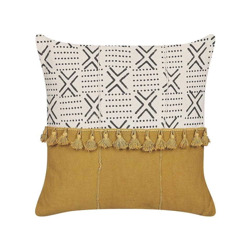 Boho kussens met kwastjes. Deze kussens zijn een ideaal accentstuk voor op je bank of op je bed. De combinatie van mosterdgele stof en handgemaakte kwastjes met geometrisch patroon zorgt ervoor dat dit een opvallende accessoire is. Ze zijn gedrukt met speciaal uniek motief verkregen dankzij de blokdruk techniek. Als je op zoek bent naar een set kussens die uniek en prachtig zijn dan zijn deze kussens perfect voor jou.