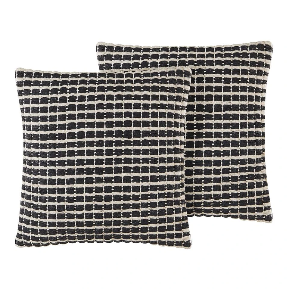 Set van sierkussens in geruit patroon. Met deze prachtige sierkussenset krijgt je bank niet alleen extra comfort, maar hij ziet er ook nog eens geweldig uit. De sierkussens zijn gemaakt van hoogwaardig katoen met een wollen hoes. De sierkussens hebben een ruitjespatroon in zwart-wit dat bij de meeste kleuren past. Het kussen is in bijna elke interieurstijl een geweldige aanvulling op een woonruimte of een slaapkamer. De achterkant heeft een effen kleur en een ritssluiting verborgen onder een flap.