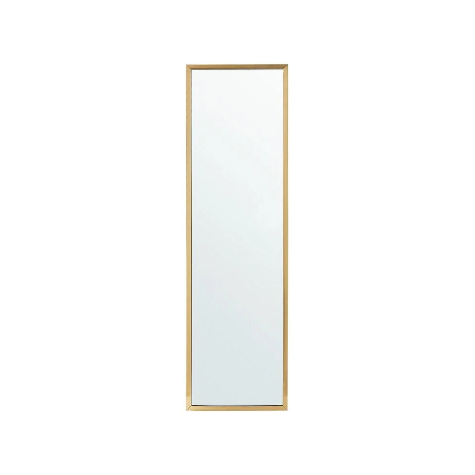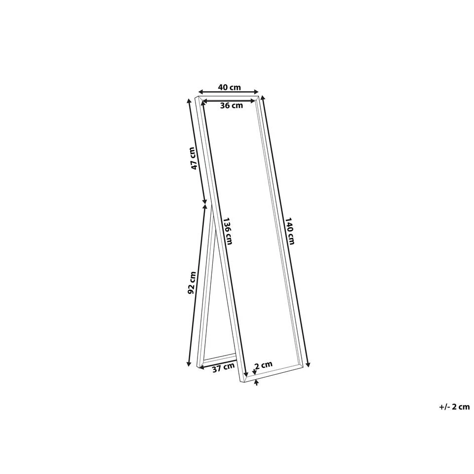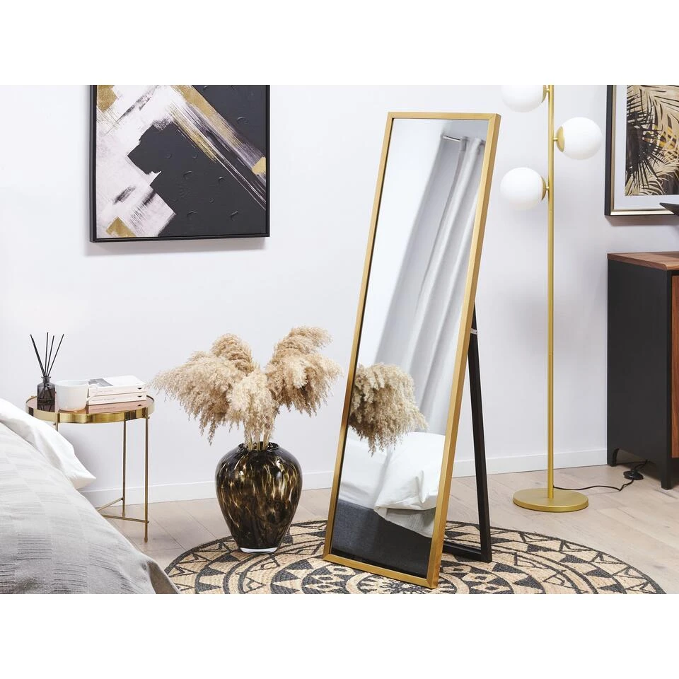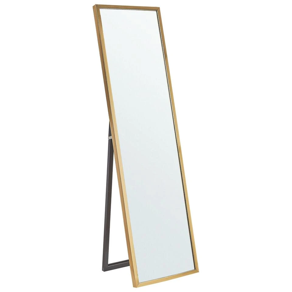 Moderne Ingelijste Staande Spiegel. Deze lange, vrijstaande spiegel is een stijlvolle accessoire voor elke slaapkamer, woonkamer of badkamer. Een slank ontwerp en minimalistisch frame passend bij elk interieur, van modern tot Scandinavisch. Het stuk is ook gemaakt van milieuvriendelijk synthetisch materiaal, wat er voor zorgt dat het lang meegaat. Met een praktische standaard, deze spiegel kan geplaatst worden waar je maar wilt om zo de kamer visueel te vergroten en reflecterend daglicht in jouw leefruimte te laten schijnen om jouw dag op te lichten.