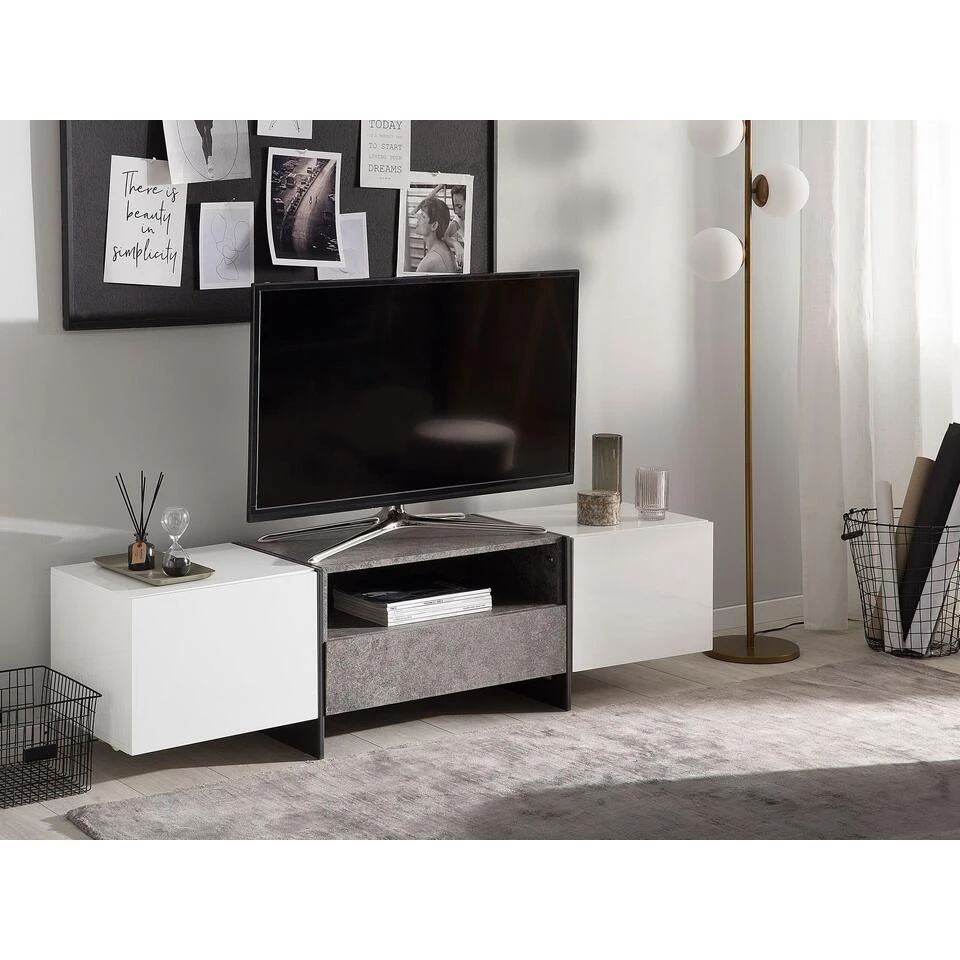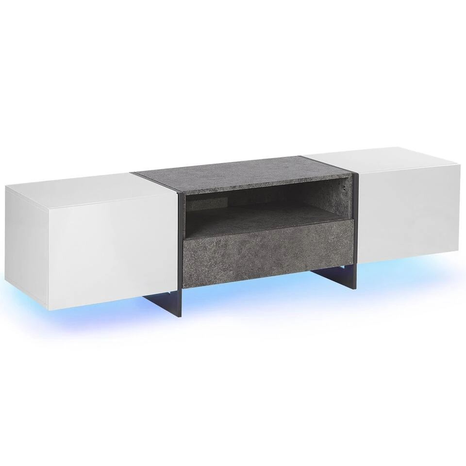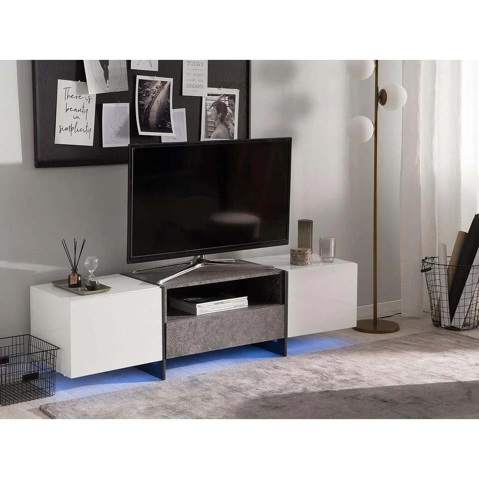 TV-meubel met LED-verlichting. Een tv-tafel die de eenvoud van de Scandinavische stijl combineert met industriële accenten, waardoor hij goed zal passen in zowel moderne als loftinterieurs. Wit fineer past perfect bij de afwerking die beton imiteert, en metalen, zwarte poten voegen lichtheid toe aan de hele structuur. De kast is uiterst functioneel dankzij de ruime kasten waarin je gemakkelijk diverse accessoires of apparatuur kwijt kunt.