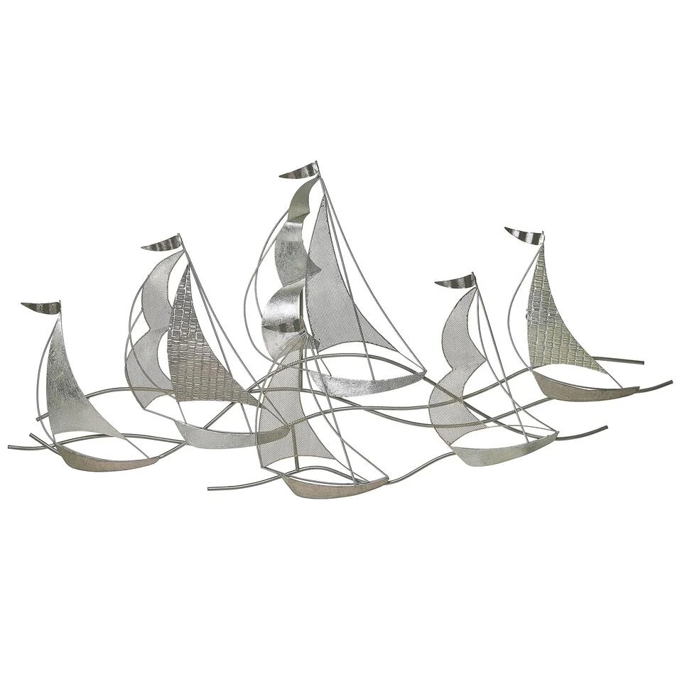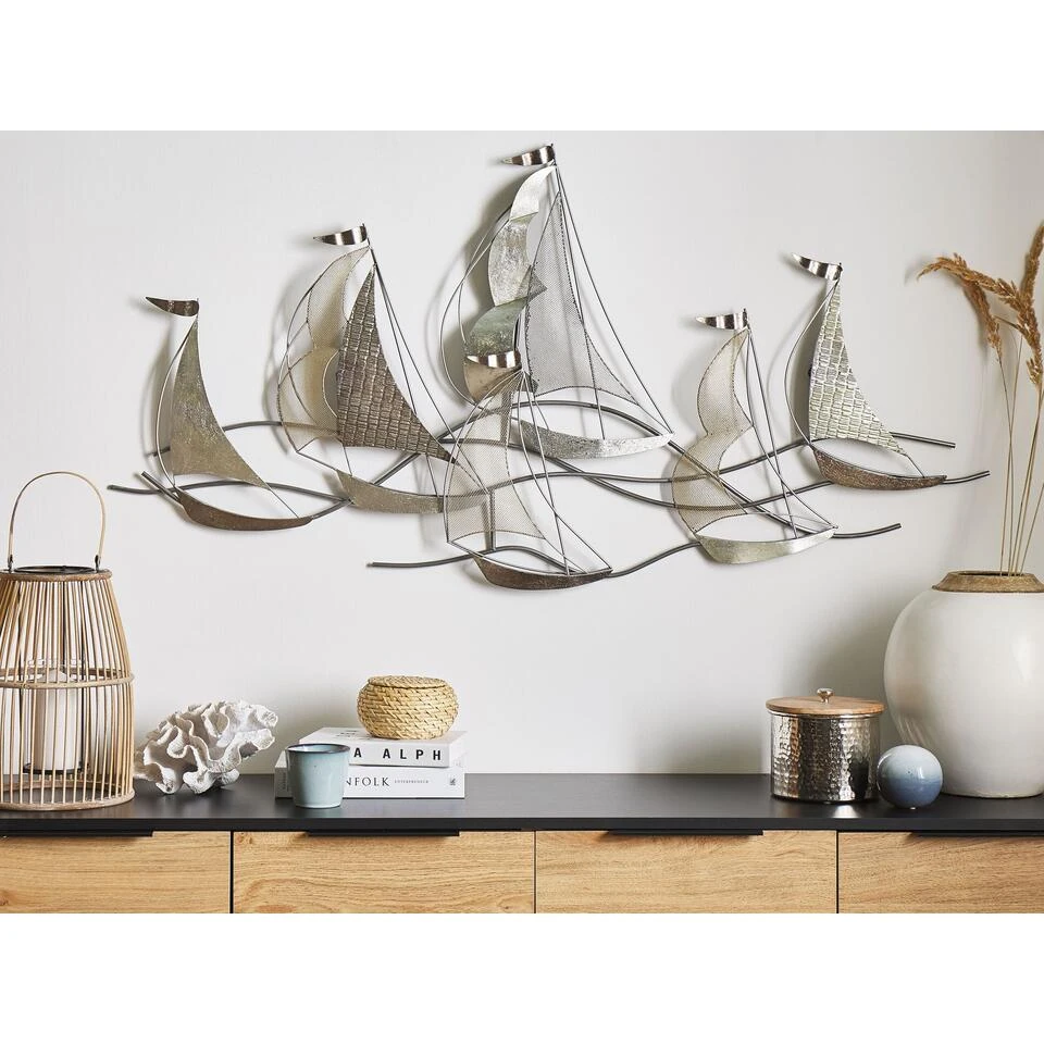 Metalen wanddecoratie met marine thema. Geef je interieur een maritieme sfeer dankzij deze opvallende wanddecoratie. De 3D-compositie van zilverkleurige boten ziet er goed uit op lichte en donkere muren. Het stuk is gemaakt van hoogwaardig metaal dat stabiliteit en duurzaamheid garandeert. Hang hem boven de open haard, kast of bank en geniet van de schoonheid van deze ware eye-catcher.