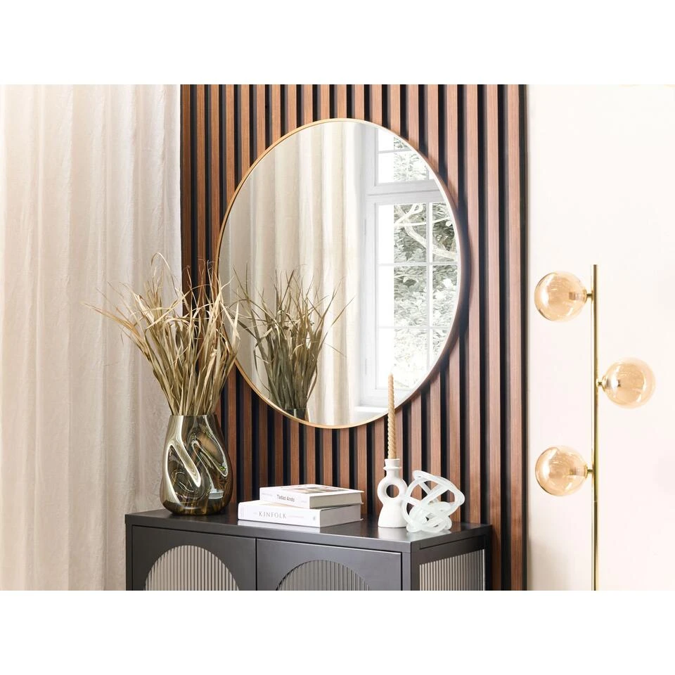 Decoratieve muurspiegel . Open je ruimte en breng meer licht binnen met behulp van een decoratieve spiegel. Deze ronde spiegel zal prachtig staan in de gang, zodat je jezelf kunt checken voordat je naar buiten gaat, of in de woonkamer waar hij een opvallend decoratief wandaccent zal worden. De subtiele metalen omlijsting geeft de spiegel een eigentijdse uitstraling.