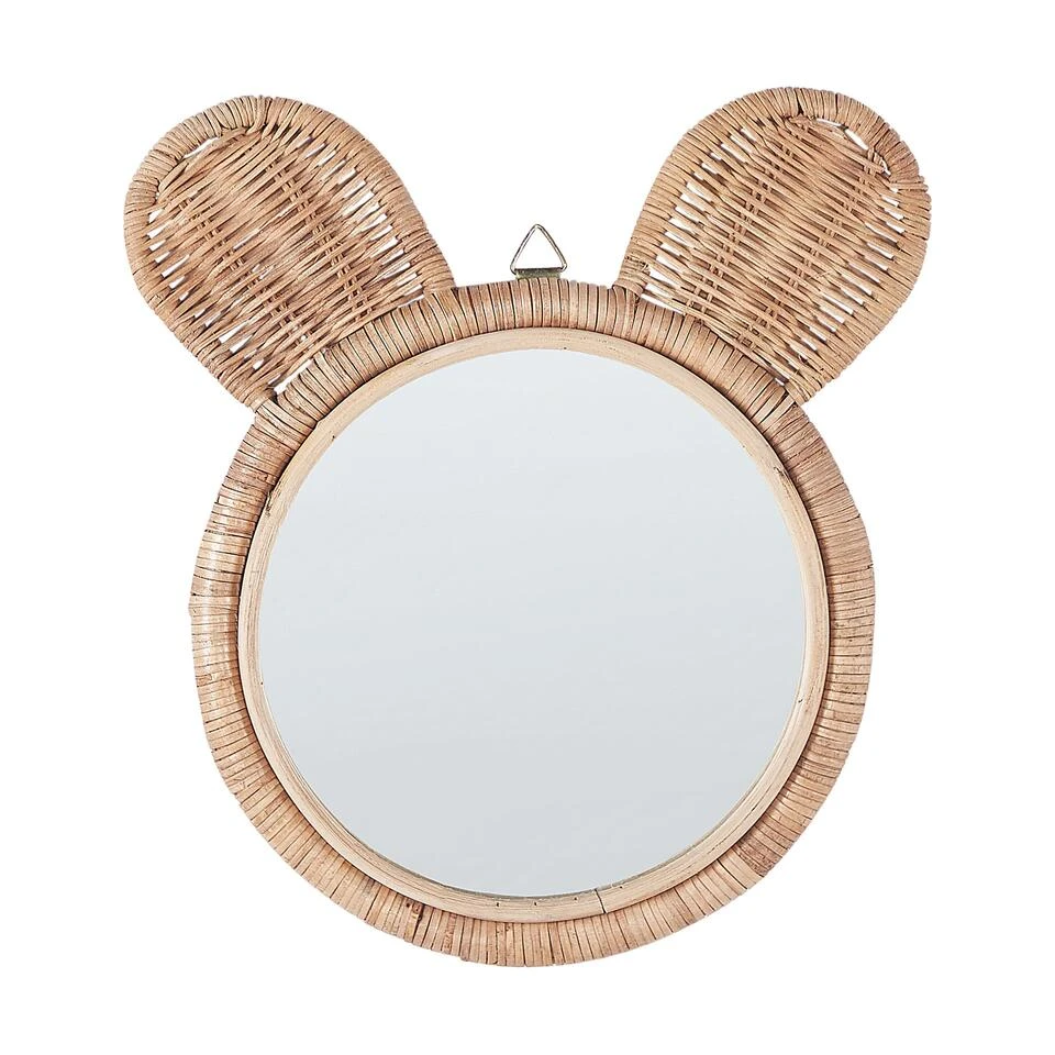 Decoratieve spiegel met beren oren. Ben je op zoek naar een spiegel waar je kinderen gek op zullen zijn, dan is deze een must-have. Door zijn schattige berenoren zullen je kinderen elke keer lachen als ze naar zichzelf kijken in de spiegel. Het handgeweven frame is gemaakt van natuurlijk rotan en heeft een haakje om gemakkelijk op te hangen.