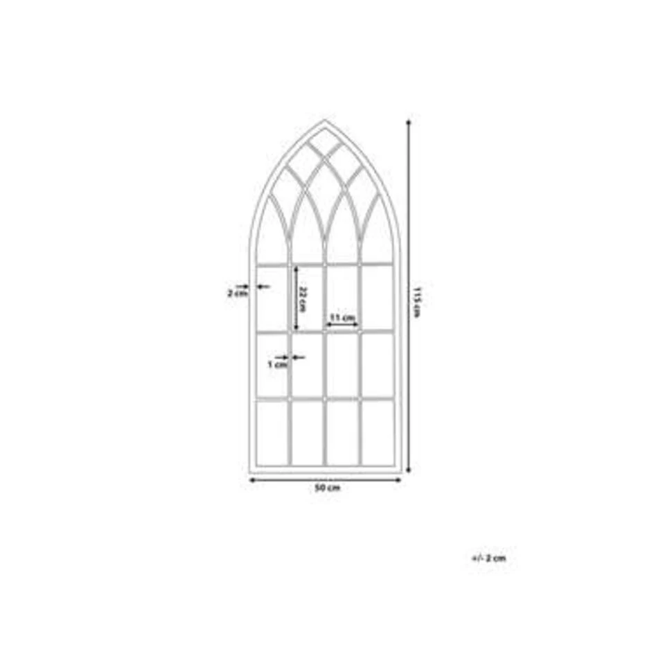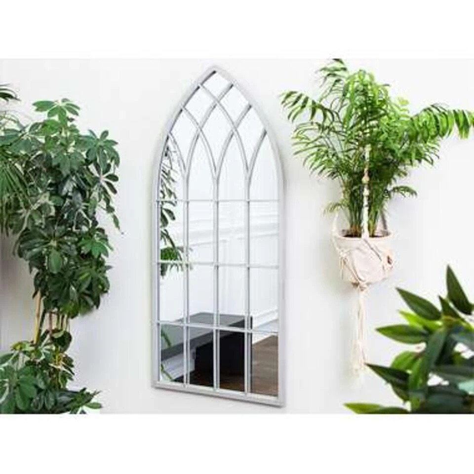 Stijlvolle gotische muurspiegel in grijs. Deze chique antiek grijze wandspiegel geeft veel interieurs een extra accent. De vormgeving van de spiegel refereert aan de raampartijen van indrukwekkende gebouwen in gotische stijl. De spiegel is gemaakt van hoogwaardig metaal en glas. De spiegel kan naar behoefte in elke woonruimte worden geplaatst.