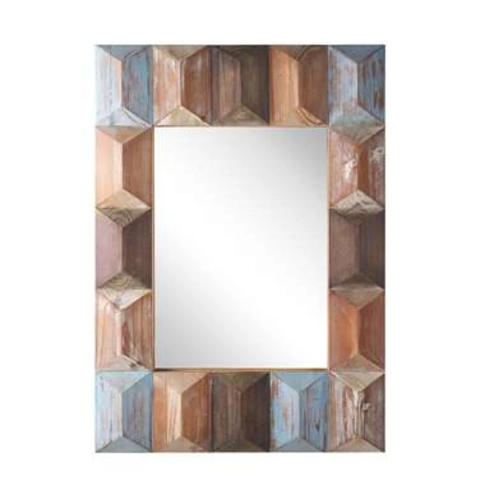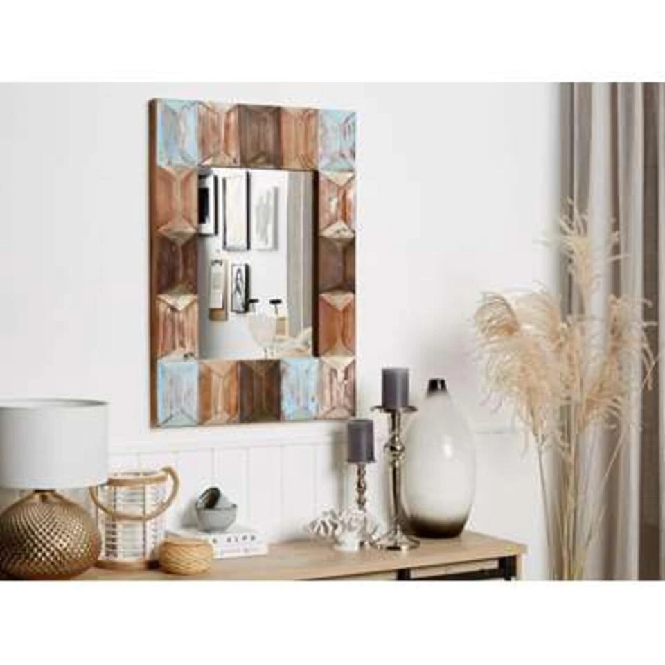 Rustiek geïnspireerde handgemaakte spiegel met lijst. Verfraai jouw leefruimte met een opvallend, rustiek accent met deze unieke spiegel. Het stuk heeft een handgemaakt sparrenhouten frame in natuurlijke afwerking voor een frisse uitstraling. Het prachtigw houtsnijwerk wordt benadrukt door pastelblauwe verf die een retro-charme van de jaren 90 toevoegt. Hang hem op in je woonkamer, slaapkamer of gang en maak je interieur stijlvol af.