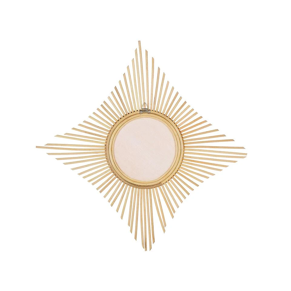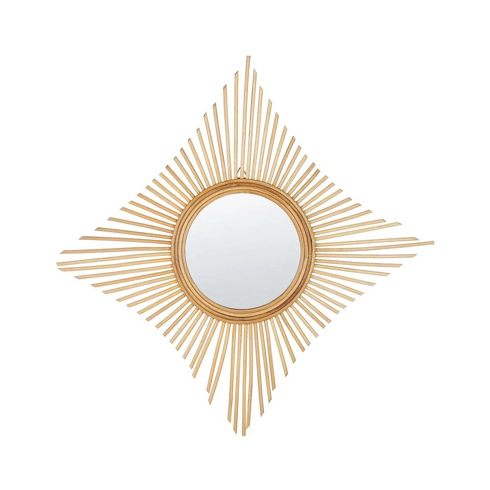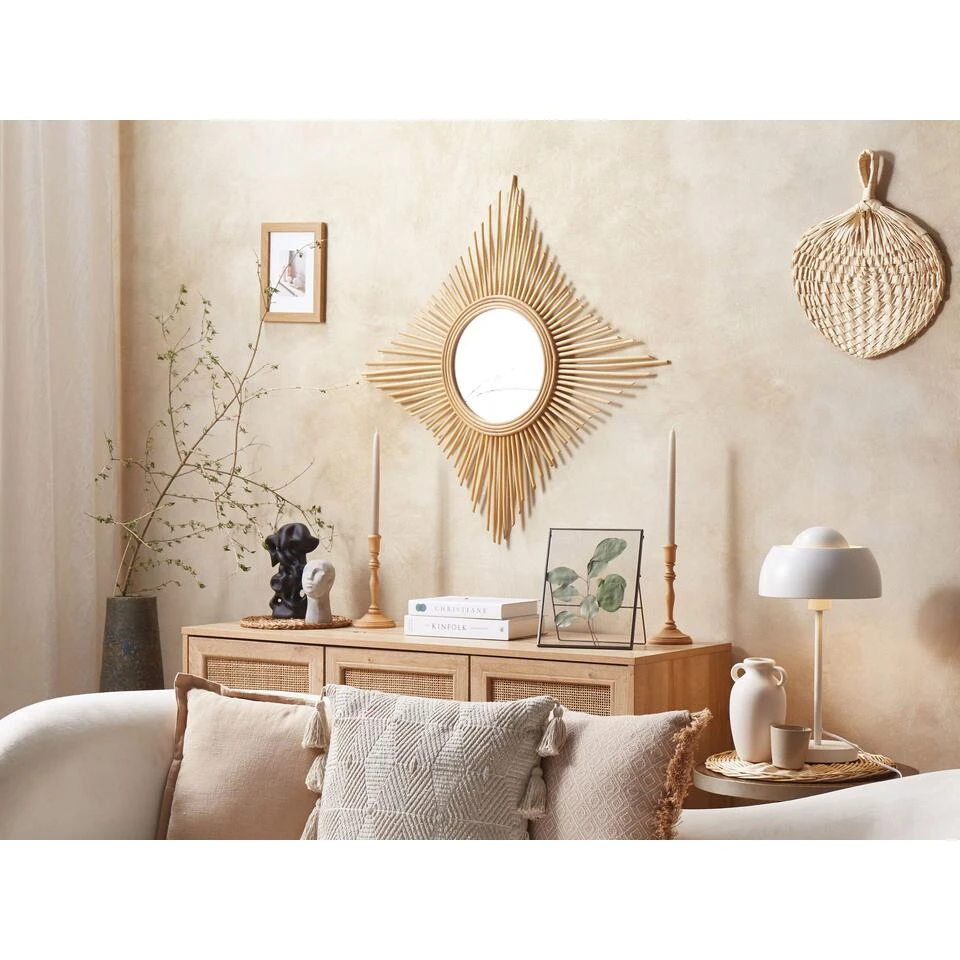 Sierlijke Vorm Accent Rotan Spiegel. Deze spiegel in een originele designvorm zal een interessant accent aan je interieur geven. Het lijstwerk is gemaakt van natuurlijke rotan takken die in een ruit zijn aangebracht, wat de spiegel een unieke look geeft die in de meeste slaapkamers of woonkamers past. De bevestiging is eenvoudig dankzij de meegeleverde ophanghaken.