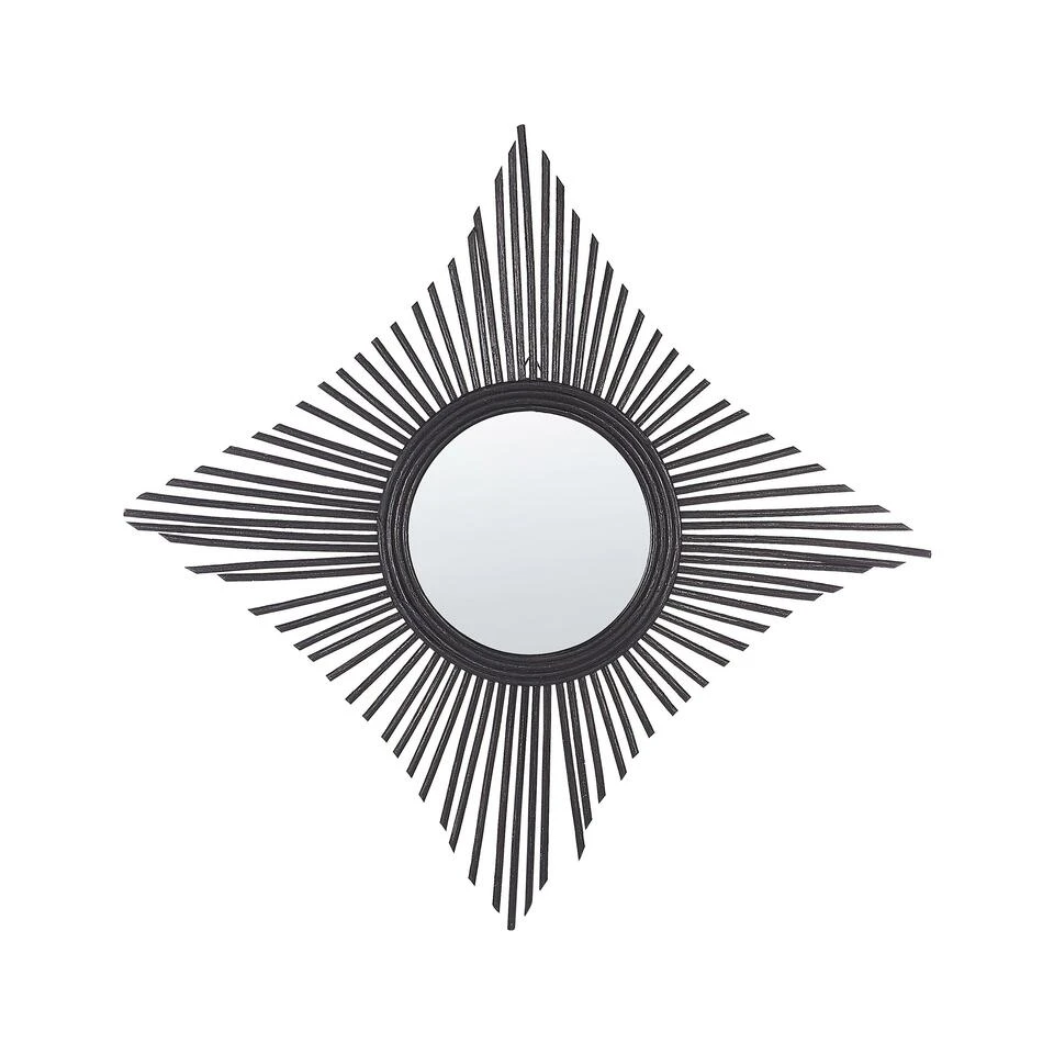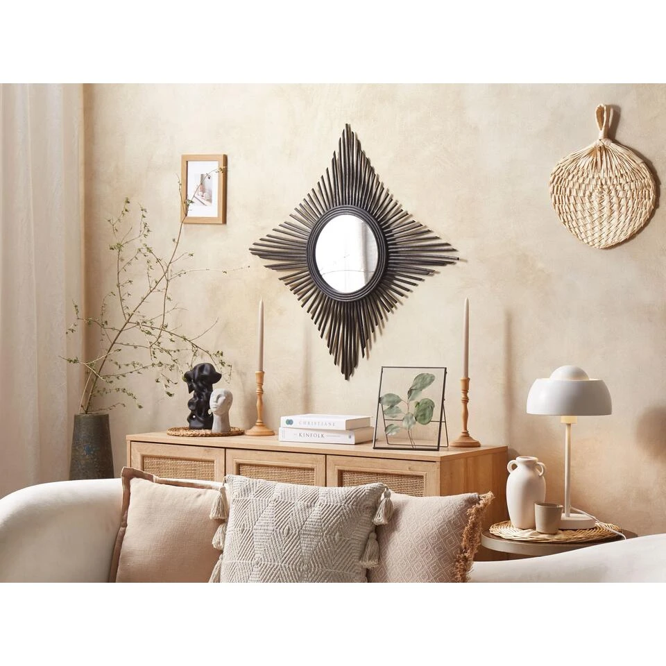 Sierlijke Vorm Accent Rotan Spiegel. Deze spiegel in een originele designvorm zal een interessant accent aan je interieur geven. Het lijstwerk is gemaakt van natuurlijke rotan takken die in een ruit zijn aangebracht, wat de spiegel een unieke look geeft die in de meeste slaapkamers of woonkamers past. De bevestiging is eenvoudig dankzij de meegeleverde ophanghaken.