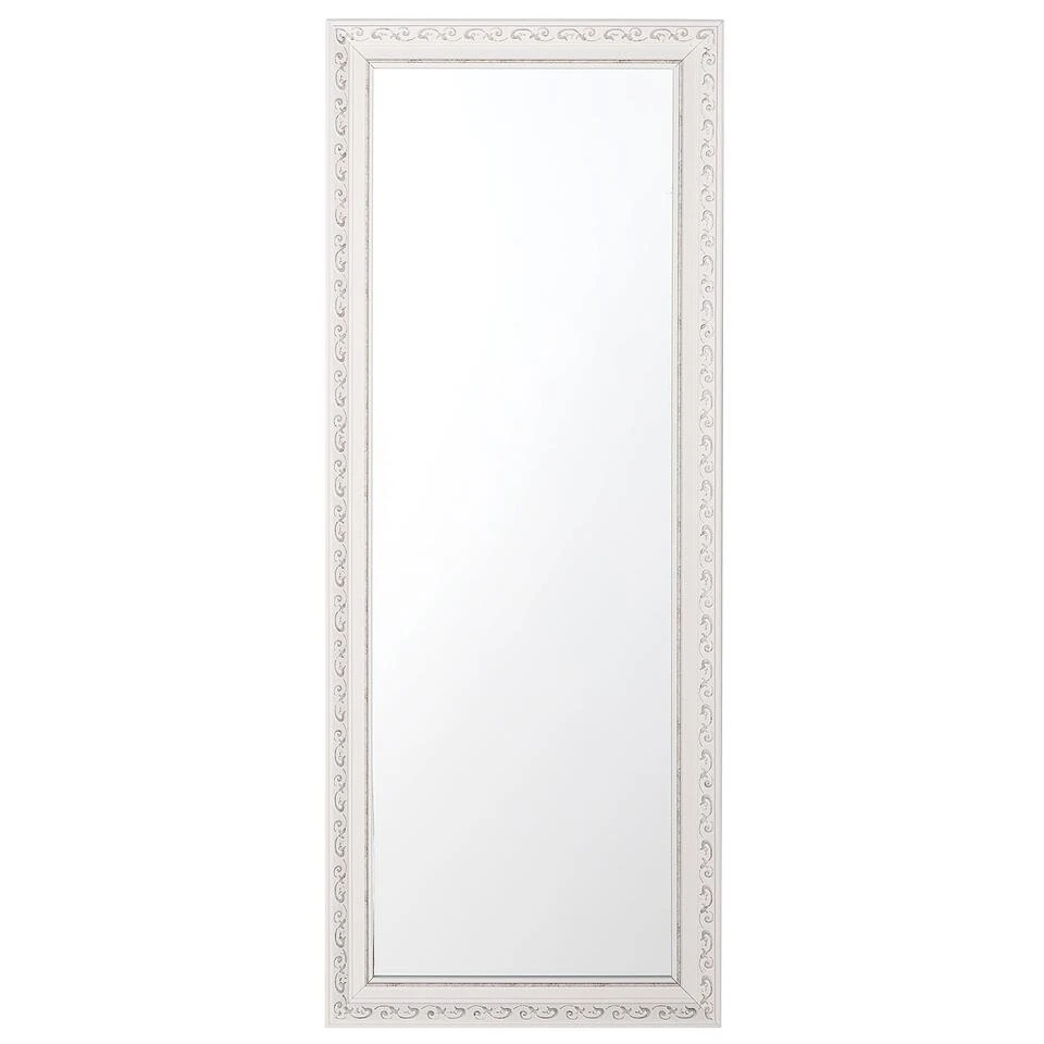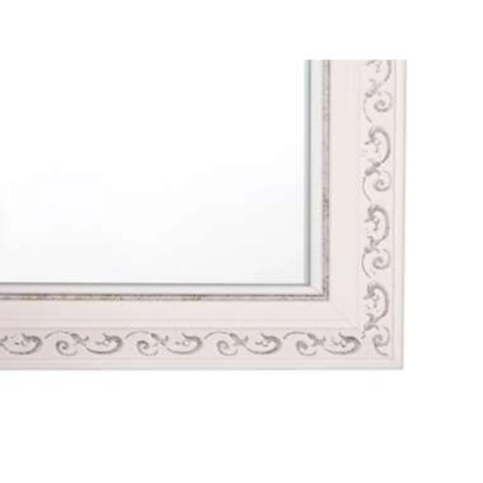 Stijlvolle muurspiegel . Glamour voor thuis – Deze wandspiegel in klassieke, rechthoekige vorm overtuigt dankzij de elegante kleurencombinatie van wit en zilver en de subtiele ornamenten op het frame. Het kan worden gecombineerd met verschillende soorten meubels en kan in staand of liggend formaat aan de muur worden bevestigd.