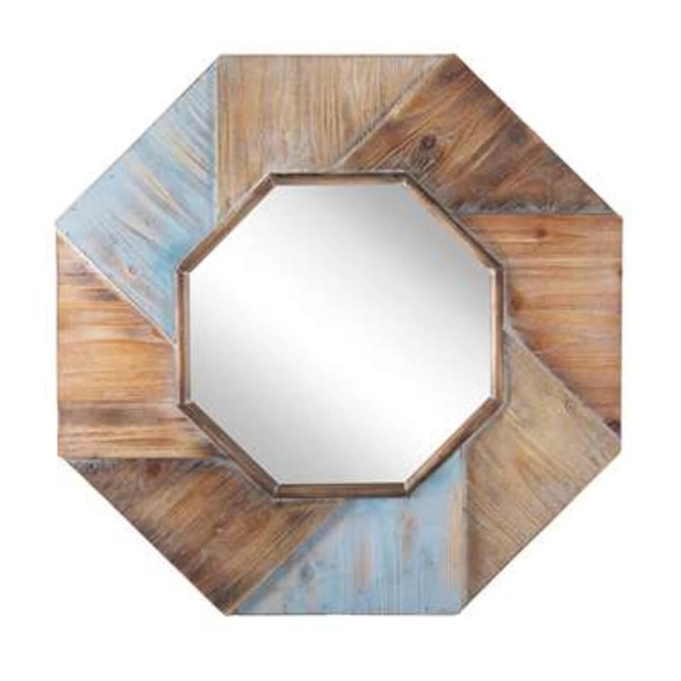 Achthoekige rustieke spiegel. Deze prachtige spiegel past perfect bij elk rustiek en minimalistisch interieur. Het duurzame, handgemaakte frame heeft een natuurlijke, lichte houtafwerking die wordt aangevuld met pastelblauwe verf voor een beetje contrast. Het delicate patroon voegt een retro charme toe aan het stuk, waardoor het ook uitstekend past bij industriële en traditionele interieurs.